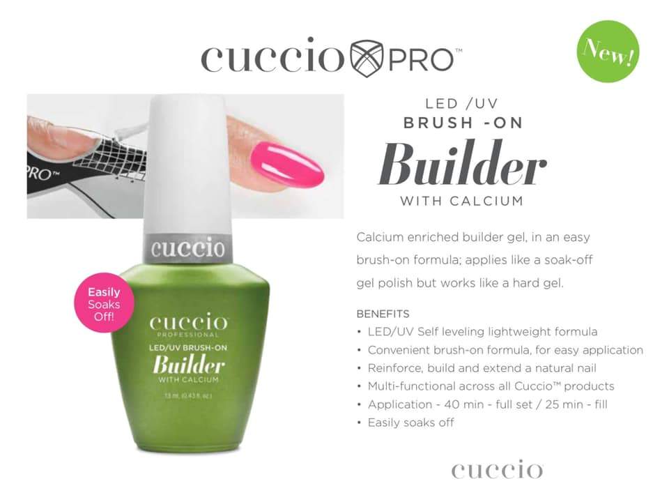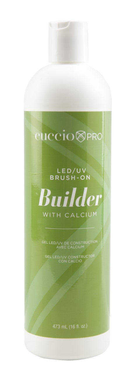 The Brush-on-Builder Gel is formulated with Calcium. Easy brush-on formula. It applies with soak off gel polish but works like a hard gel. It has been formulated with a self-leveling lightweight formula. The brush on formula allows you to apply it easier and faster. Helps reinforce, build and extend the natural nail. Easily soaks off. Why CUCCIO Doesn't evaporate, thicken, harden or yellow - 100% polish-free. Features triple pigmentation & micro-shatter technology. Extended wear, lasts until removed. What We Do Only for professionals. Perform standard nail prep, before applying your chosen prep treatment. For adhesion, we recommend applying a primer. Then in a thin, even coat, apply your chosen base. Cure before applying one coat of your chosen color, and cure again. Apply another coat until desired opacity is achieved, ensuring you cure in-between coats. Once you have finished applying color, apply one coat of top. Wipe the sticky layer off all nails with a conditioning cleanser.