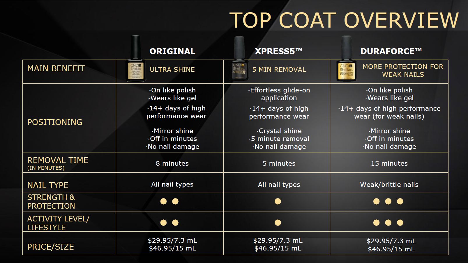 WHAT IT DOES Provides a superior protective top layer for the Responsible for a hard, scratch-resistant, crystal shine for the CND SHELLAC color service.