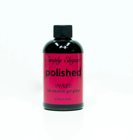 - Apply POLISHED no cleanse gel gloss top coat and cure 30 seconds.