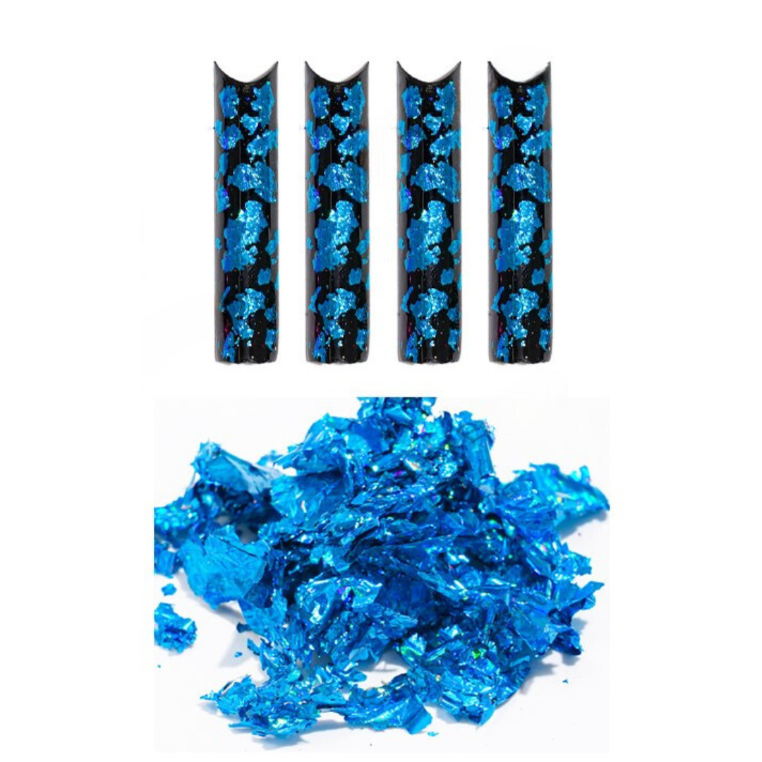 Experience the mesmerizing beauty of Holo Blue Foil Leaf nail art with Gemini. Each special leaf creates a captivating glimmering effect that will turn heads. Transform your nails into a sparkling masterpiece.