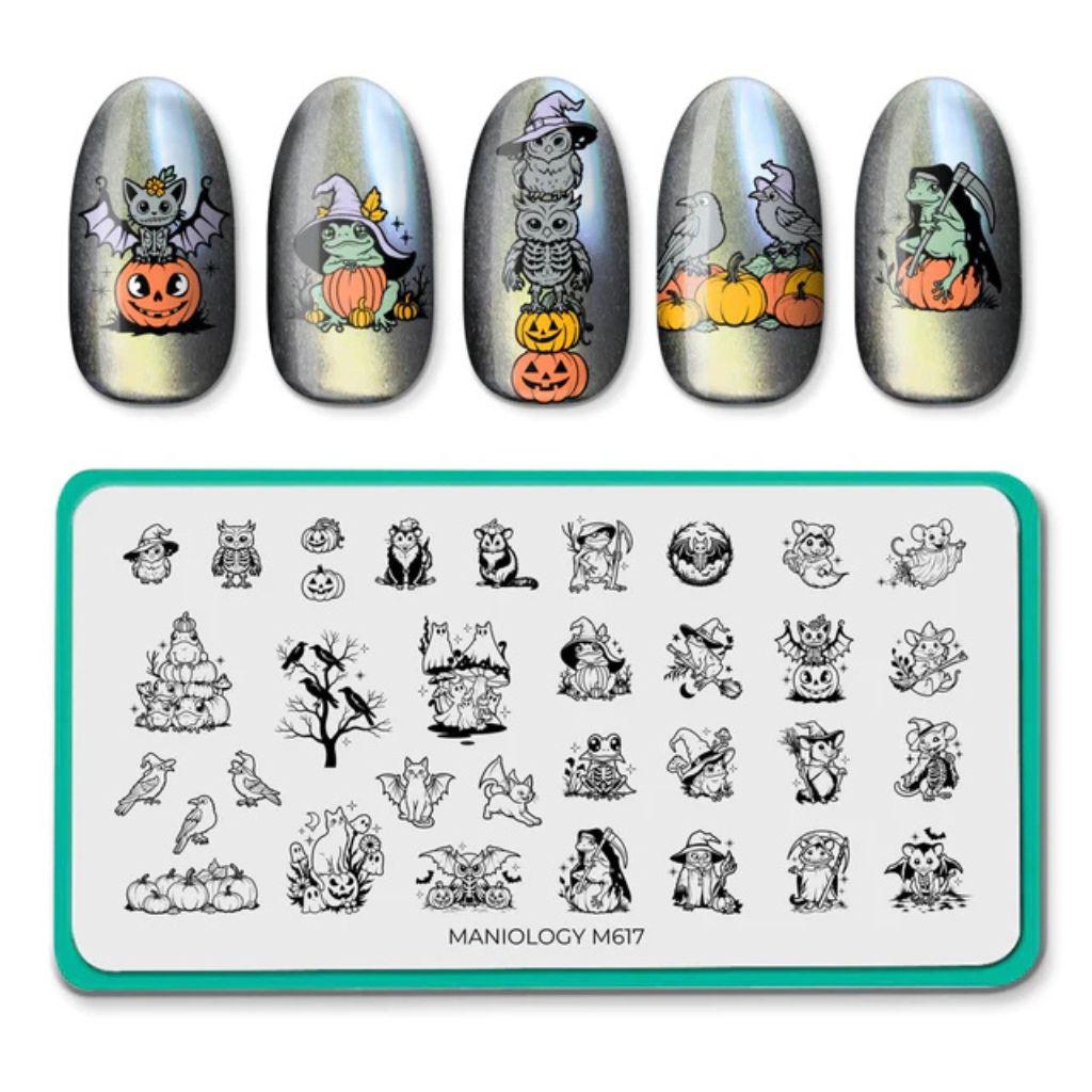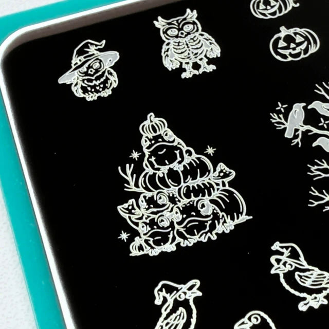 Charm your nails with some witchy cuteness using this uniquely enchanted plate. The Friendly Familiars stamping plate features frightfully adorable animals like owls, bats, toads, mice, and mystical cats, in charming witchy styles, paired with enchanted garden touches like mushrooms and pumpkins. Whimsical, magical, and just a bit mischievous, perfect for whipping up spooky Halloween nails.