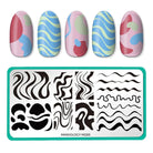 Ride the waves of this funky 70's inspired plate. Layer wave after wave for multi-colored, groovy manicures or go with the flow using our full nail and buffet sized patterns. These wavy patterns include lines and blobs of different widths and thicknesses for organic, free-flowing movement in your manicures.